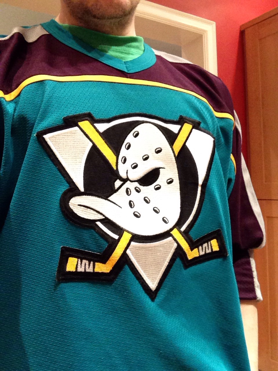 In 1998 I had the pleasure of travelling to Minnesota with members of the 5/8 Kings Regiment, 4 QLR, and a few from my very own V (the Liverpool Scottish) Company, to train with the Ohio National Guard in Camp Ripley Minnesota. It was part of an exchange programme, where an equal number of their boys came over to the UK (and probably wondered why soldiers were treated like dogs). While there, we had a day’s R&R, where we went to the Mall of America, a big ass place full of shops, restaurants and a cinema. Private Ryan had just come out, and so the myself and the other three jocks went to watch that. After coming out shell-shocked (spectacular film), we went shopping, where I spotted the jersey below; the jersey of the Mighty Ducks of Anaheim.